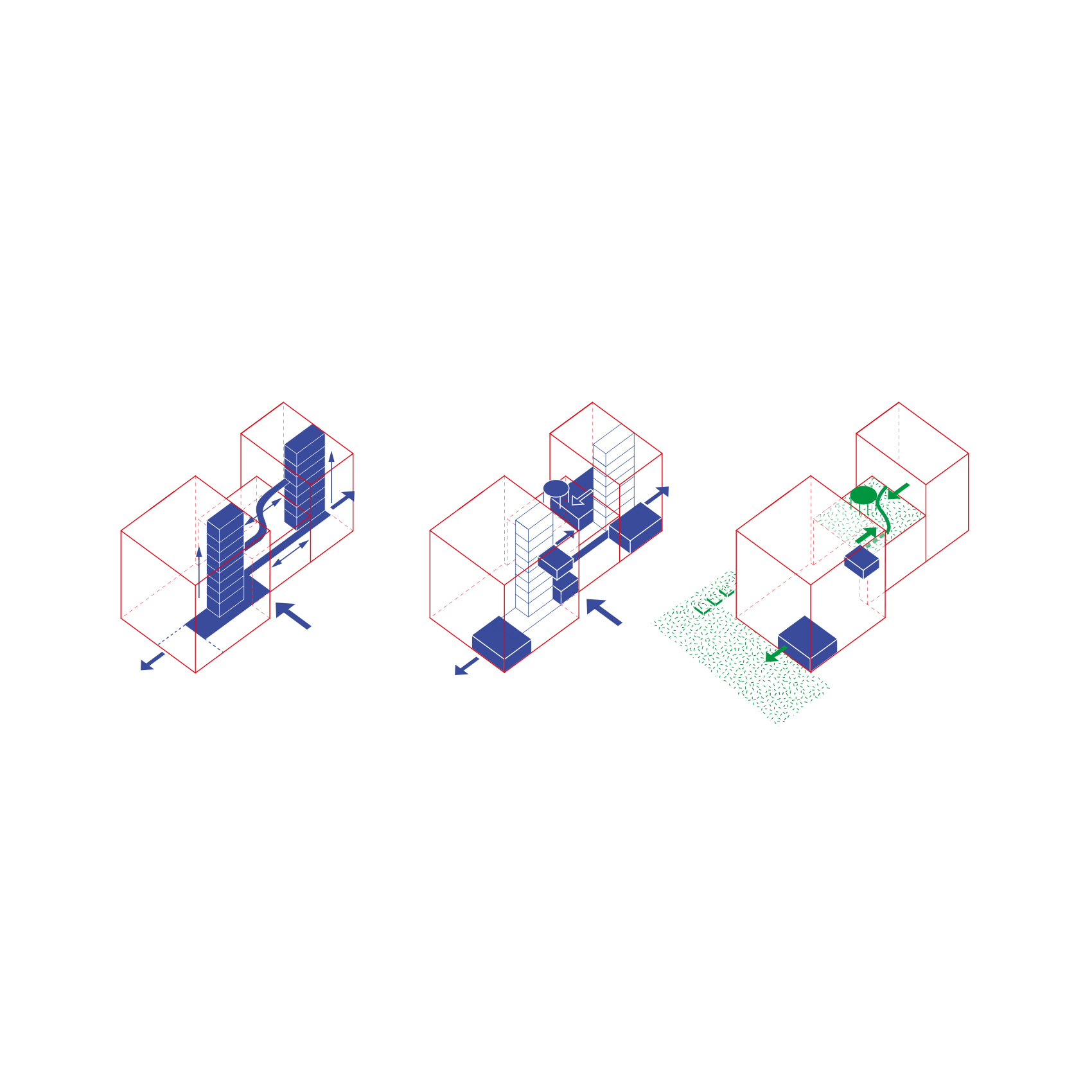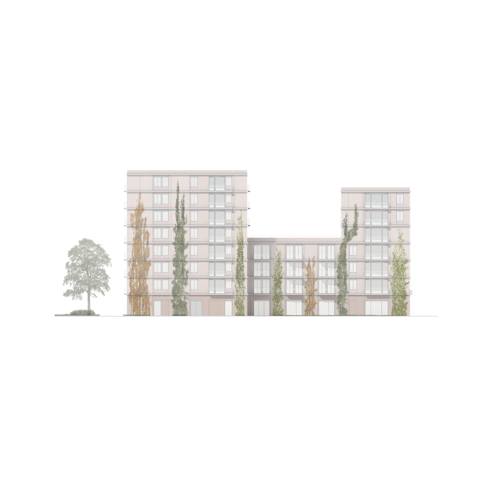 Dem Thema des Eingangs ins grüne Stadtquartier verschreibt sich das Projekt konsequent: neben Baumpflanzungen, Grünflächen und versickerungsfähigen Belägen unterstreicht die Fassadenbegrünung als vorgesetztes Grünes Kleid den Gesamtcharakter des Quartiers. Durch die gezielte Bündelung der Fensterflächen, etwa in Form zusammengefasster Zimmerfenster, sowie durch die Belichtung von Wohnräumen und Küchen über großzügig verglaste Loggien, werden zusammenhängende, weitgehend geschlossene Fassadenbereiche freigehalten. Die Fassade wird dabei anhand wiederkehrender Elemente gegliedert: Beton-Gesimse, vertikale Stahlstäbe, dazwischengespannte Begrünungsgitter und schlanke Balkone mit zarten Balkongeländern vermitteln ein detailliertes Erscheinungsbild des Grünen Kleides.