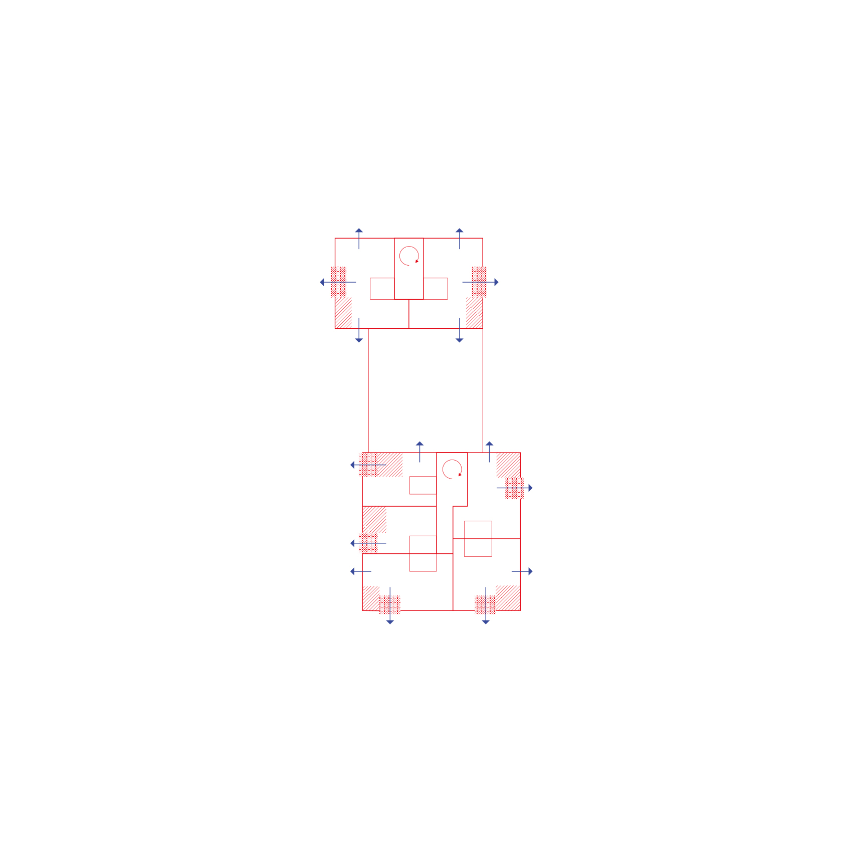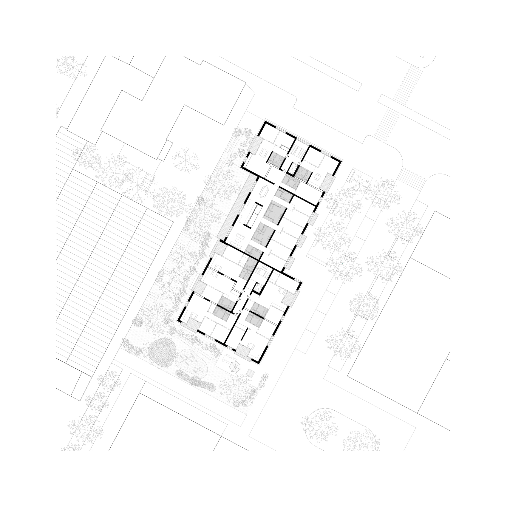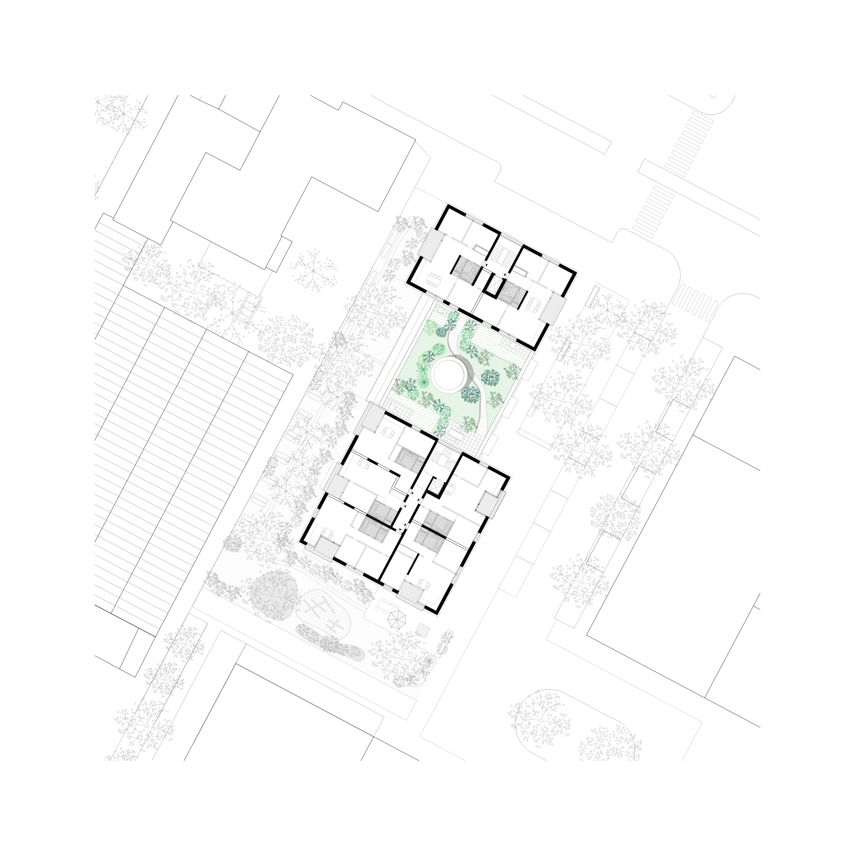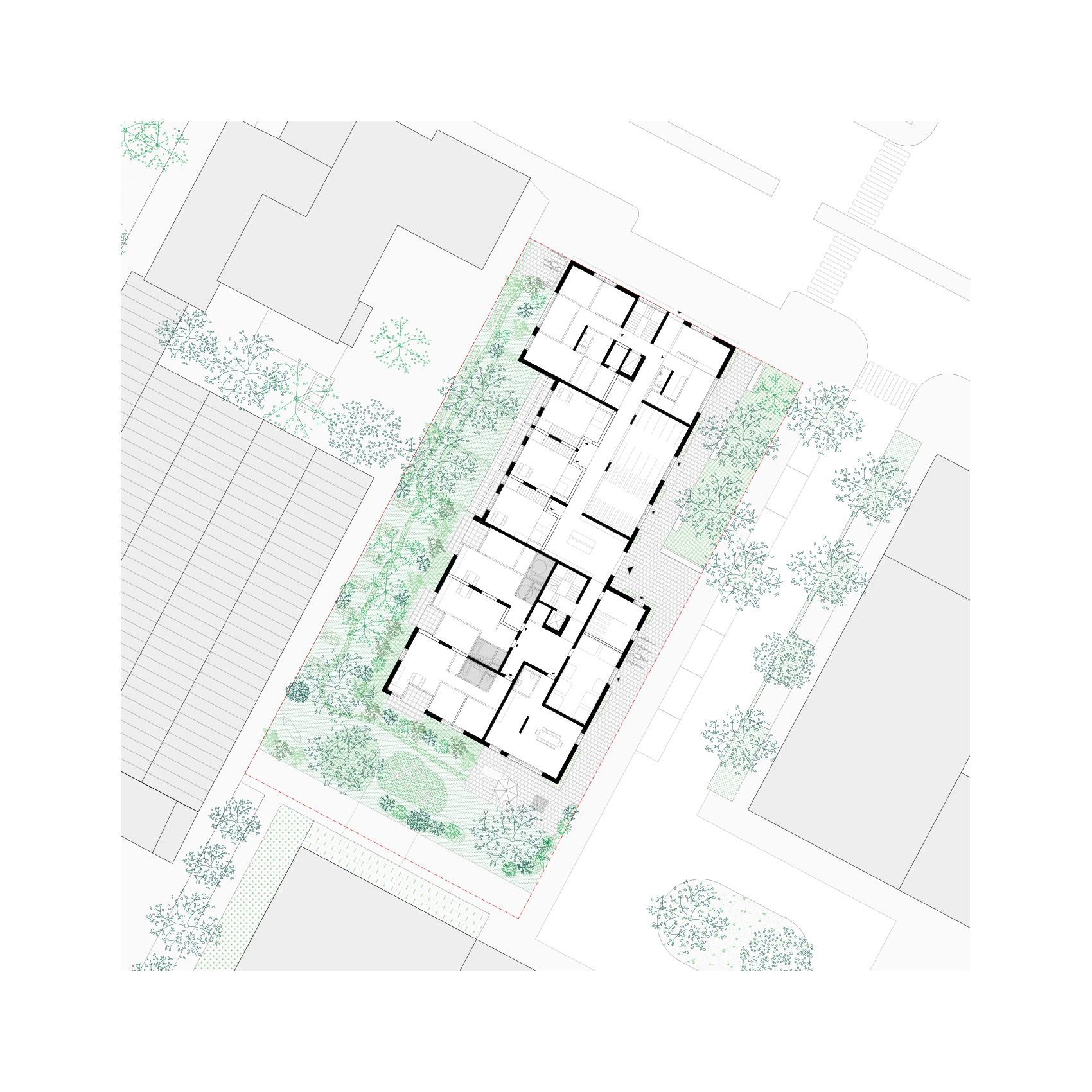 In den beiden Hochpunkten werden die Loggien durch vorgelagerte, schmale Balkone ergänzt, wodurch eine fein abgestufte Tiefenwirkung der Fassade entsteht. Der Zugang erfolgt über ein großzügiges gemeinsames Entrée im Mittelteil. Von hier spannt sich im EG eine längs verlaufende Erschließungsspange auf und verbindet neben den beiden in die Hochpunkte führenden Treppenhäusern auch Büroflächen im Norden (Verwaltung Wohngruppen, Homeoffice), den gartenseitigen Gemeinschaftsraum im Süden sowie dazwischenliegende Nebenräume (Kinderwagen, Fahrrad, Müll).