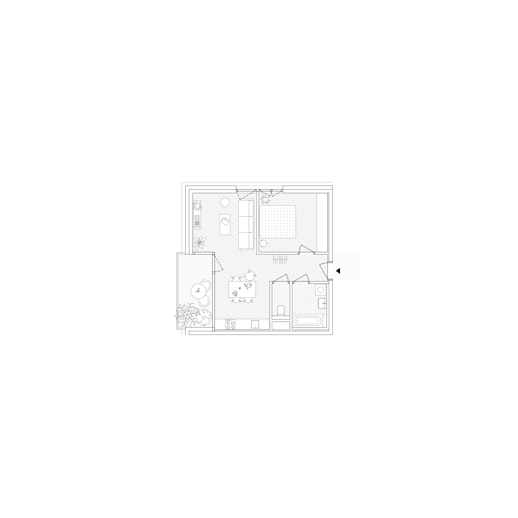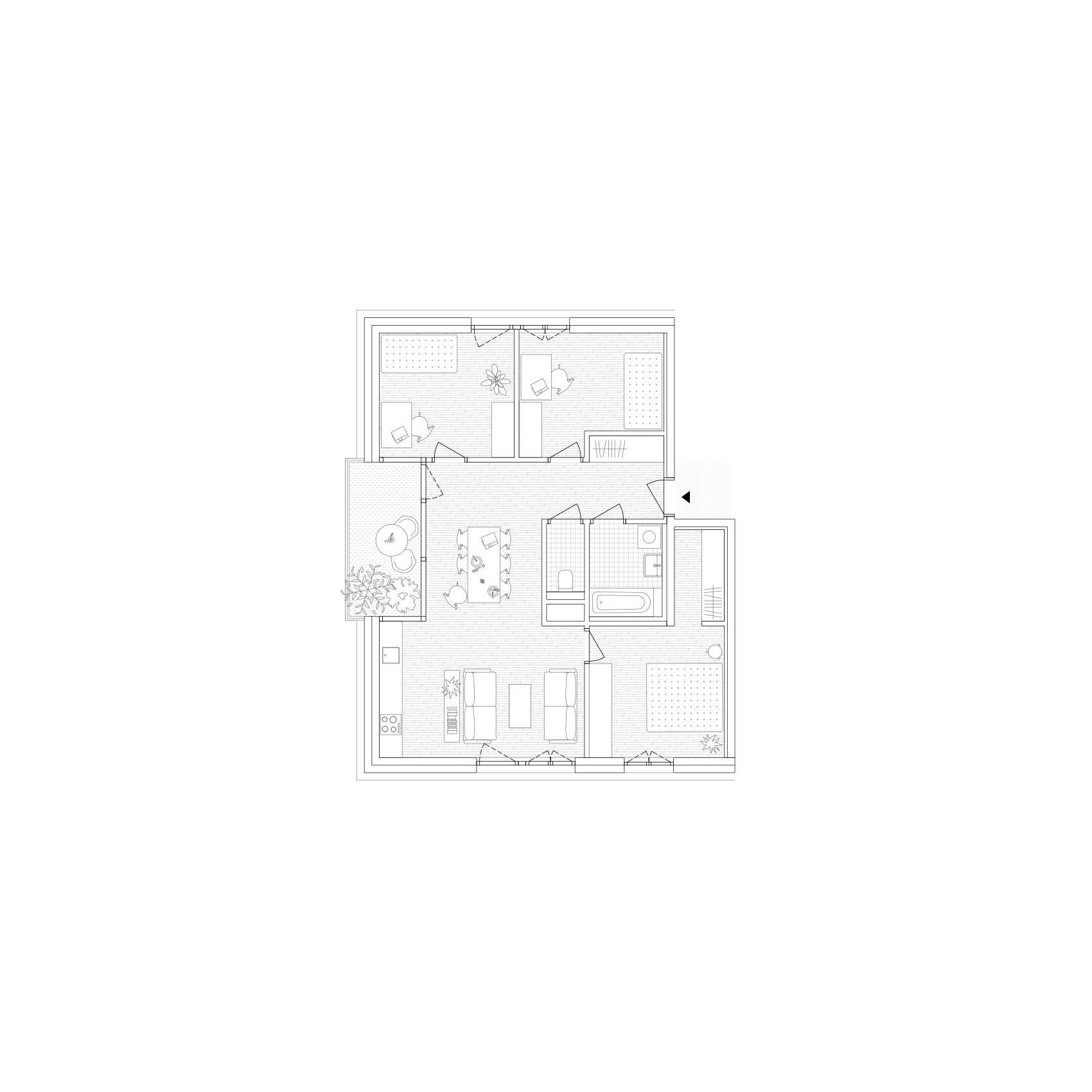 Das gewählte Erschließungssystem gewährleistet für den Großteil der Wohnungen eine mindestens zweiseitige Belichtung und damit auch die Möglichkeit der Querlüftung. Die Organisation der Wohnungen definiert die Lage der Sanitärzonen im Inneren, während die Küchen bewusst nach außen orientiert sind. Zusammen mit den angrenzenden, großzügig eingeschnittenen und verglasten Loggien – den sogenannten Gartenzimmern – bilden sie den zentralen, offenen Bereich der Wohnung. Die Loggien werden durch schmale Balkone ergänzt, die sich vor das Küchenfenster erstrecken und zur individuellen Begrünung einladen.
